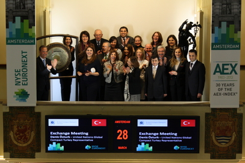 Cees Vermaas, CEO of NYSE Euronext Amsterdam, Deniz Ozturk, Turkey Representative of the UN Global Compact, and a delegation of sustainable banking representatives from Turkey participate in the closing bell ceremony at the Amsterdam Stock Exchange.